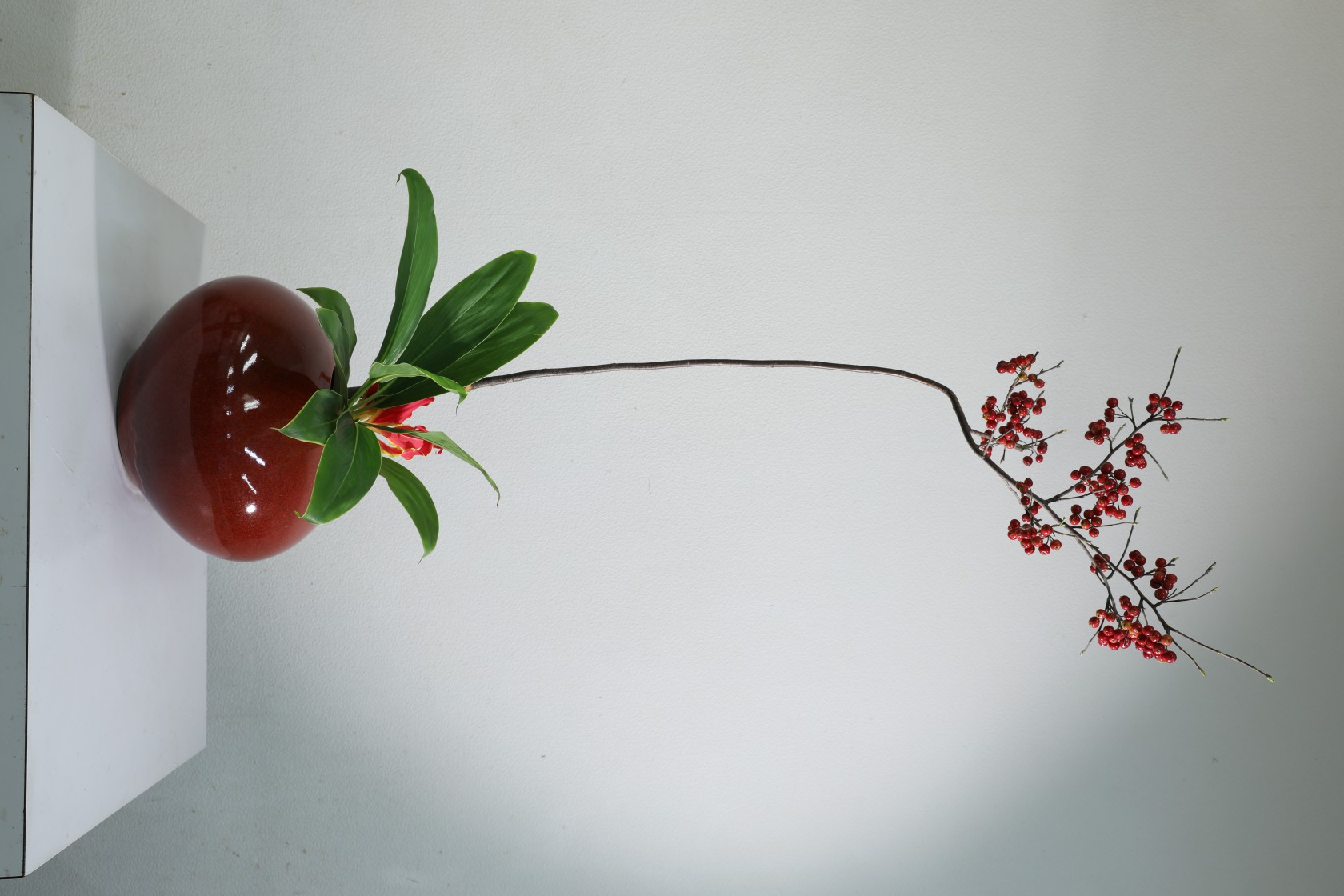 趣のあるアロニエを引き立たせるため、足元にはドラセナと挿し色の赤い花のみで構成してます